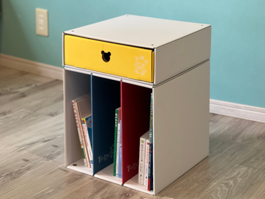 引き出しの上に絵本ラックを設置しておりましたが、 もう直ぐ2歳の子が上の絵本を取ろうとのしかかることが多く 下の本棚に多少歪みが出てきてしまって慌ててよく読む絵本を下に置いたりしてなんとか壊れないように維持しております。 その影響か、本棚の真ん中の上の部分が差し込みから出てきてしまって垂れ下がってるのを良く目撃するようになってしまいましたが ささっと差し込み直して少し形を整え直せば元通りになりましたので 自分で組み立ててると構造もわかっているので対処しやすくて良いですよね。 |